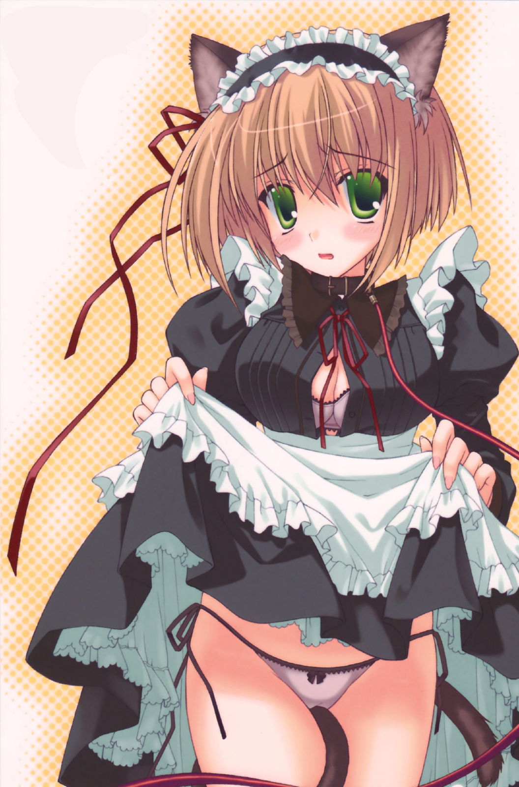 1girlanimal earsapronblushbrabreastsbrown haircat earscat tailcleavageclothes liftfemale focusgreen eyeslarge breastsleashlingeriemaidmaid apronmaid headdressopen mouthpantiesribbonshort hairskirtskirt liftsolotailthighhighsunderwear