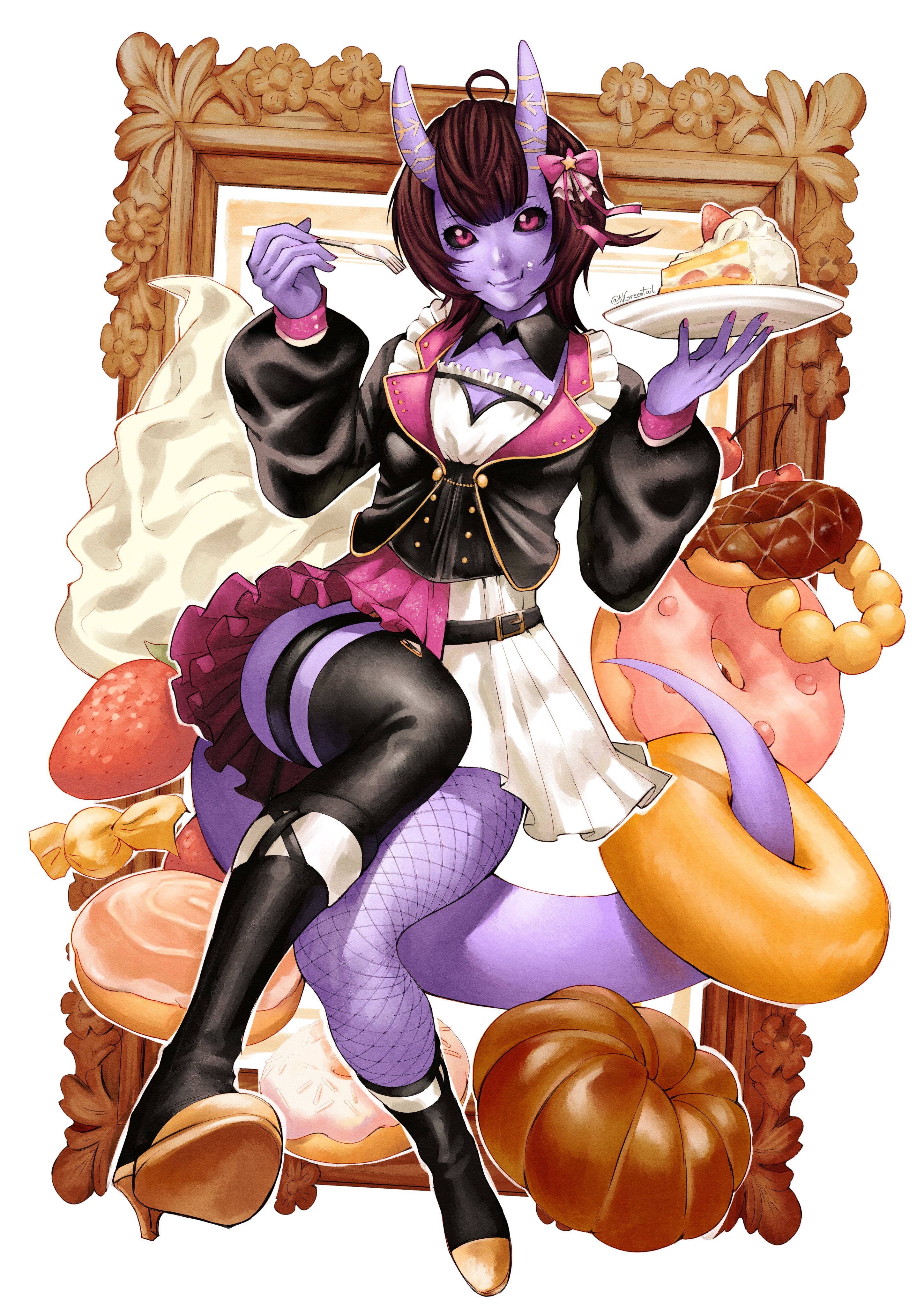 1girlahogeasymmetrical legwearbagelblack sclerabowbreastsbrown haircakecandycherrychocolate donutcolored scleracolored skincreamdemon girldessertdonuteatingfangsfishnetsfoodforkfruitfull bodyhair bowholdingholding forkholding platehornsmismatched legwearobata takeshi (style)picture framepink eyesplatepurple skinshort hairsignatureskin fangsskin-covered hornssmall breastssmilesolosplit-color clothesstrawberrystrawberry shortcaketailtwitter usernametwo-tone skirtwhite background
