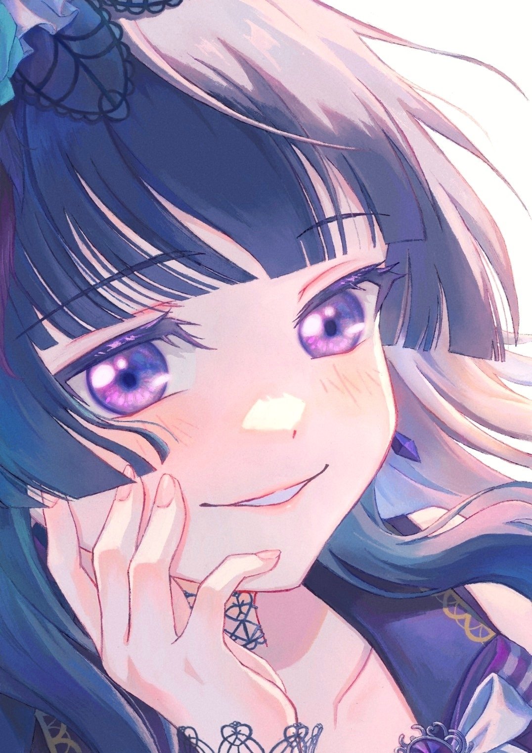1girlanimal earsblack hairblushhand on own cheekhand on own facelong hairopen mouthportraitpurple eyessolo