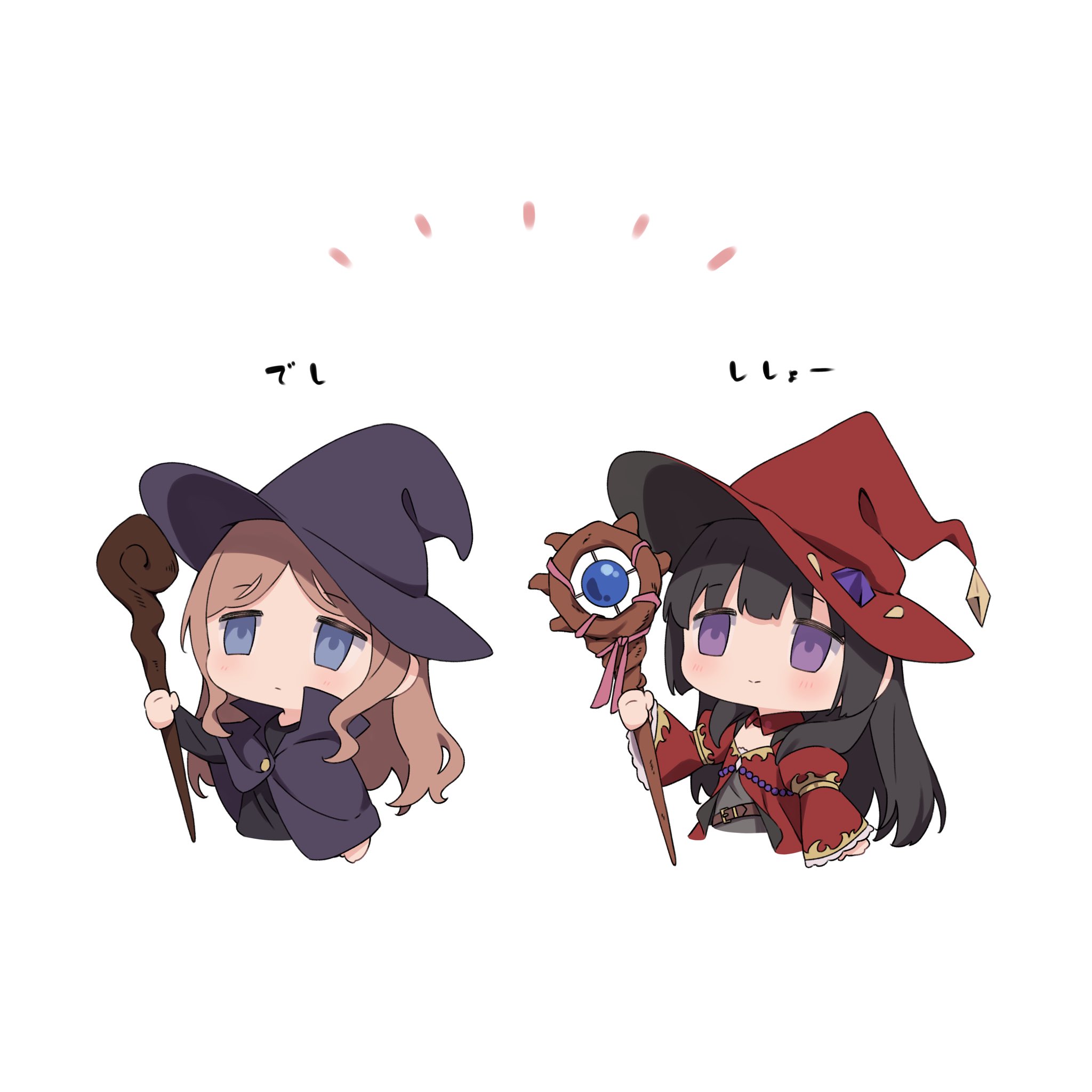 2girlsblack hairblue capeblue eyesblue hatblushbrown haircapeclosed mouthhatholdingholding stafflong hairlong sleevesmultiple girlspurple eyesred hatsimple backgroundstaffwhite backgroundwitchwitch hat