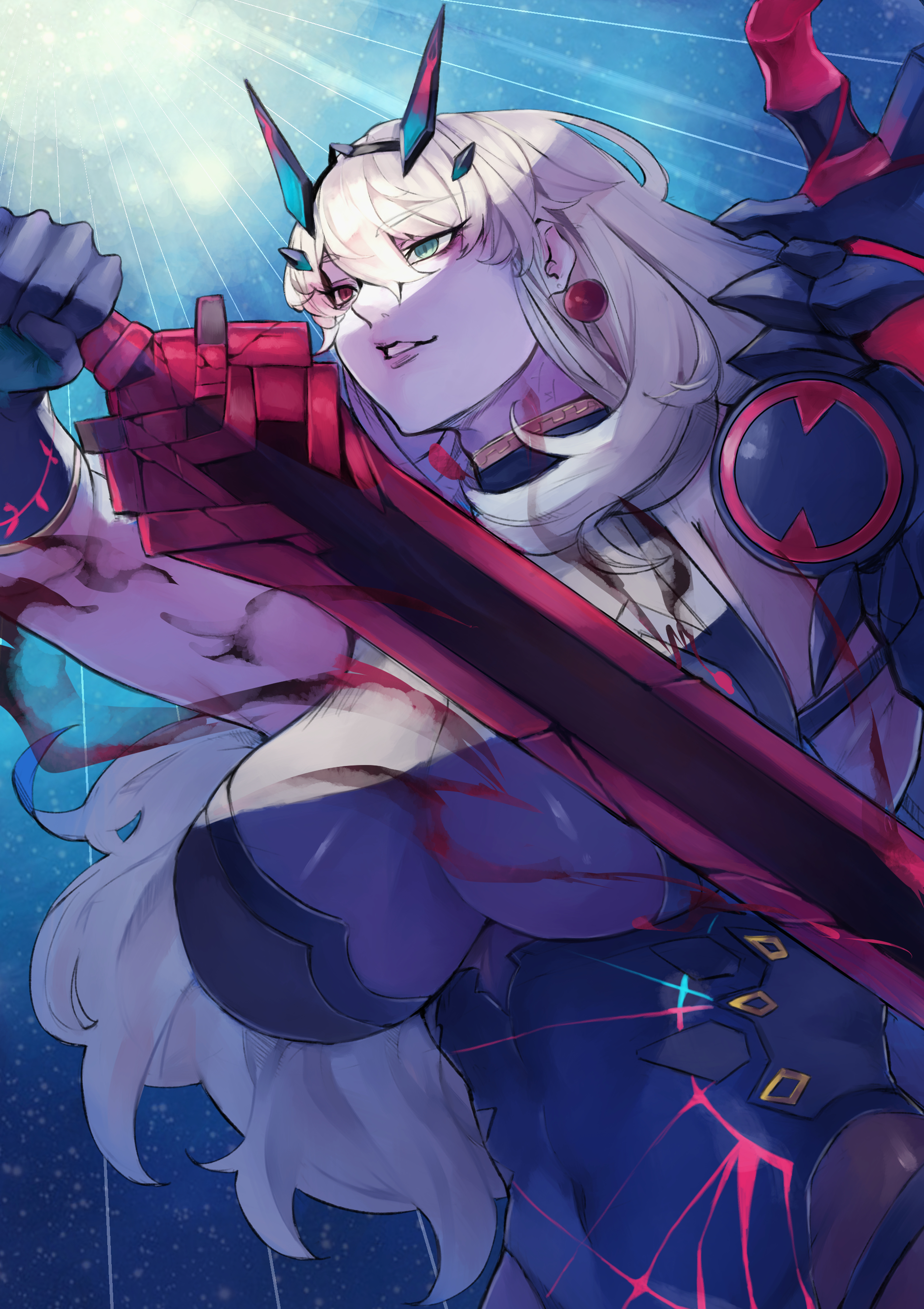 1girlarmorarmored dressblack dressblack glovesblonde hairbreastscovered naveldressearringselbow glovesglovesgreen eyesgrinhair between eyesheterochromiaholdingholding swordholding weaponjewelrylarge breastslong hairred eyessmilesoloswordtiaraweapon