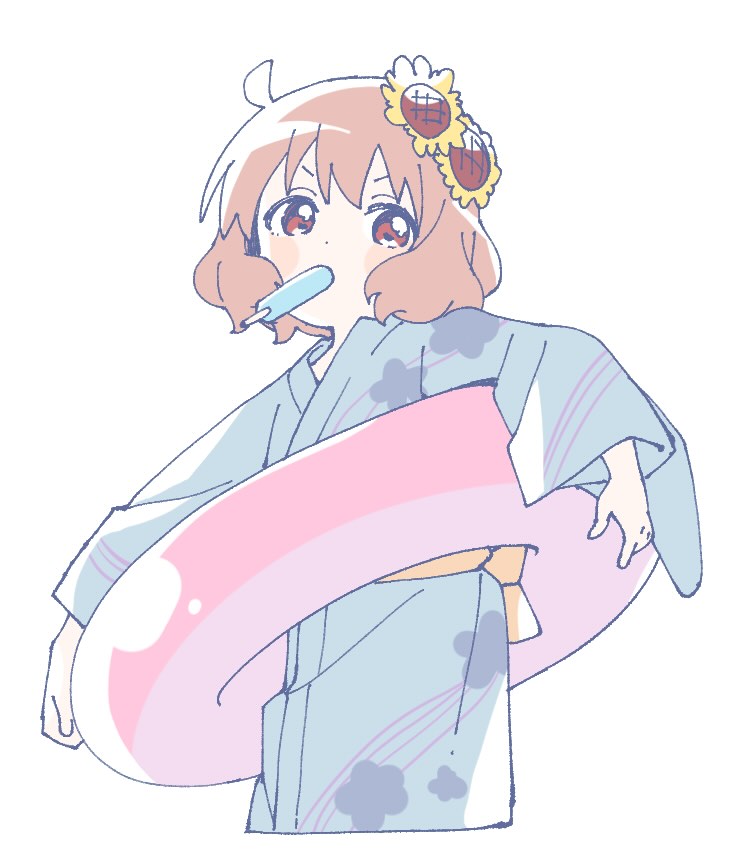 1girlblue kimonoblush stickersbrown eyesbrown haircropped torsofloral printfloral print kimonoflowerfoodfood in mouthhair flowerhair ornamentholdingholding swim ringinnertubejapanese clotheskimonolong sleeveslooking at viewerpopsiclepopsicle in mouthprint kimonosashshort hairsolosunflowerswim ringv-shaped eyebrowswide sleevesyellow sashyukata