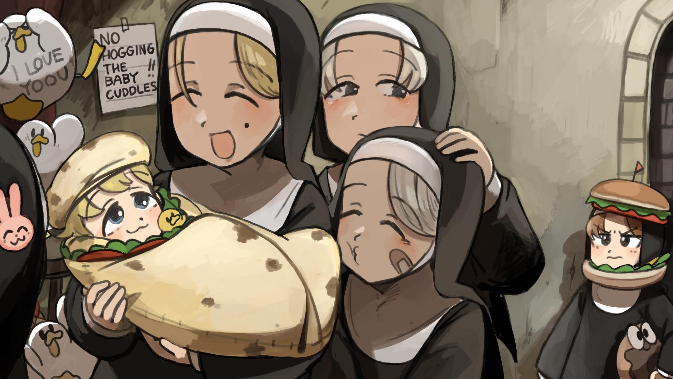 :3:d6+girlsaged downbabybaby animalbandaidbandaid on facebirdblonde hairblue eyesbody writingbrown eyesbrown hairchickenduckducklingfood-themed clothesgrey hairhair ornamentmolemole on cheekmultiple girlsnotenunopen mouthrabbit hair ornamentsmiletraditional nun