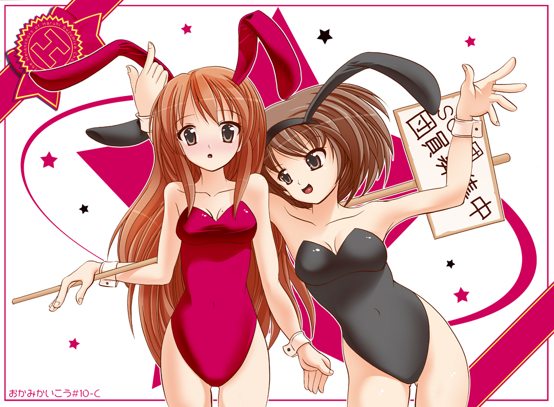 00s2girlsanimal earsbare legsbrown eyesbrown hairfake animal earslong hairmultiple girlsplacardplayboy bunnyrabbit earsshort hairsignwaving