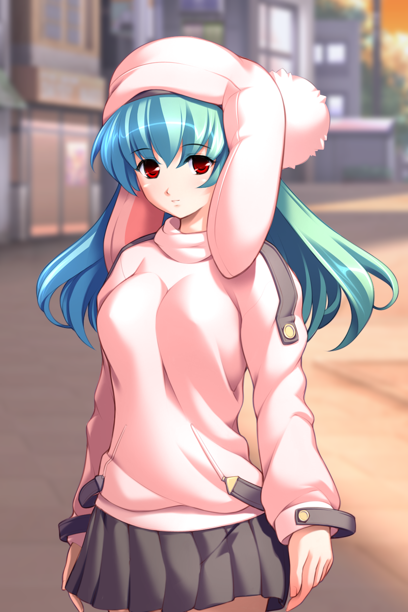 1girlanimal hataqua hairblue hairfemale focushatoutdoorspink hatrabbit hatred eyesskirtsolostanding