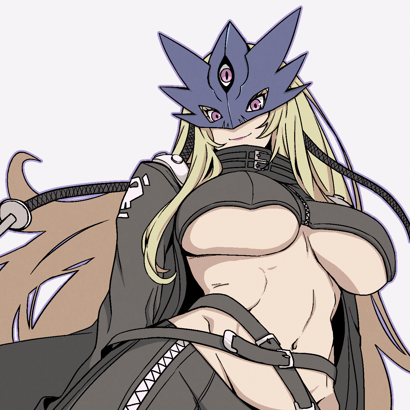 1girlarms behind backbeltblack beltblack coatblack maskblack pantsblack vestblonde hairblue maskbreastsclosed mouthcoatcowboy shotcropped vestdigimon (creature)eye maskgroinlarge breastsleatherleather pantslipsticklong hairlooking at viewermakeupmasknavelopen clothesopen coatpantspurple eyespurple lipssidelockssimple backgroundskull printsmilesolostandingstomachthird eyetight clothestight pantsunderboobvestwhite background