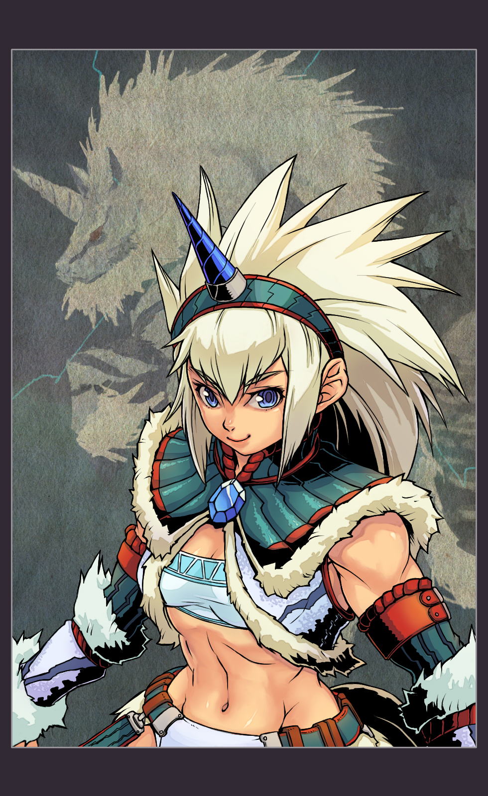 1girlabsarmorblue eyeselbow glovesfemale focusgloveshairbandhornskirin (armor)midriffmuscularsingle hornsolowhite hair