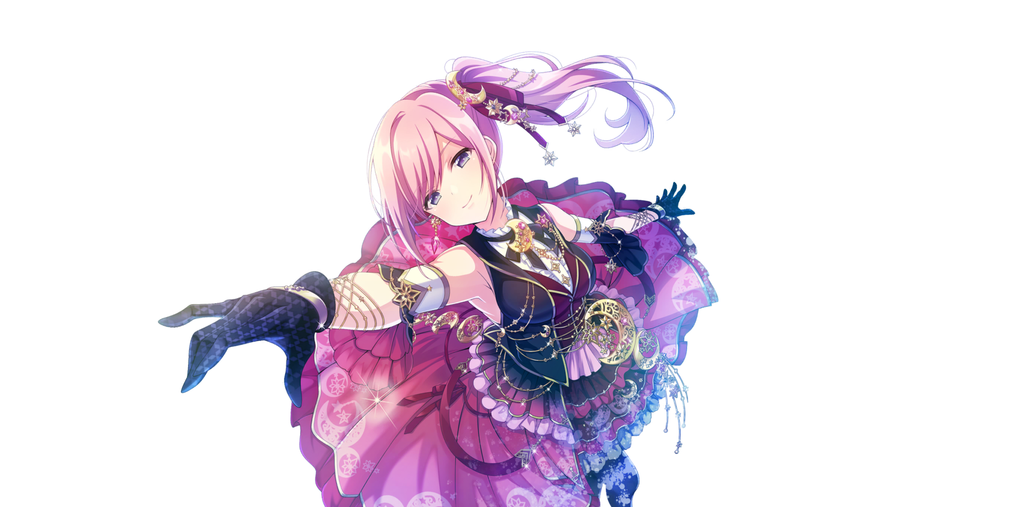 1girlarmpitsbare shouldersblack dressblack glovesbreastsclosed mouthcrescentcrescent hair ornamentcrescent printdot nosedressfrom abovegloveshair ornamenthair ribbonlong hairlooking at viewermedium breastsoutstretched armpink hairpink skirtprint glovesprint skirtpurple eyespurple ribbonreachingreaching towards viewerribbonside ponytailsidelockssimple backgroundskirtsleevelesssleeveless dresssmilesolotransparent background