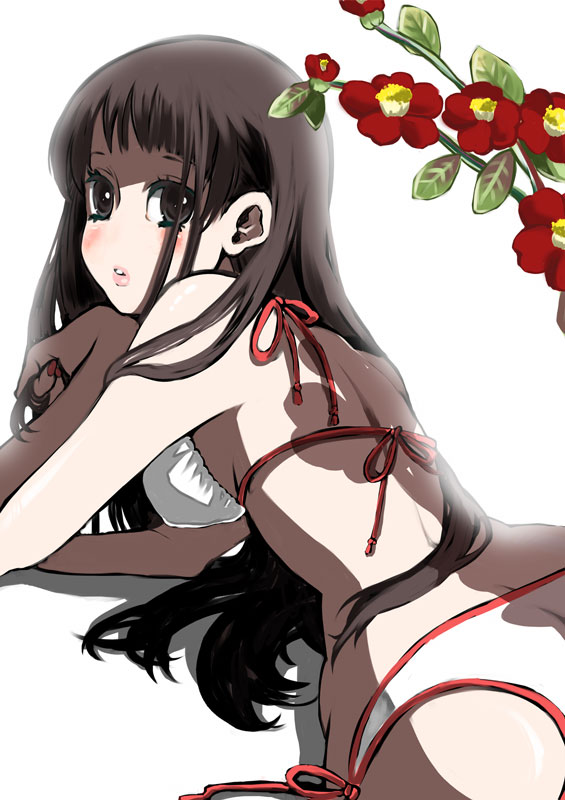 1girlassbikinibrown eyesbrown haircamelliafemale focusflowerlong hairlooking backlyingon stomachsoloswimsuitwhite bikini
