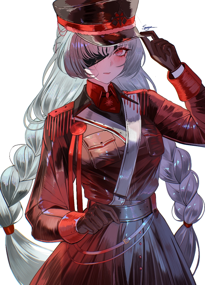 1girlalternate costumebandage over one eyeblack glovesbraidbreastsclosed mouthcowboy shotdressepaulettesglovesgrey hairhatlight blushlong hairlong sleeveslooking at viewerlow twin braidsmedium breastspeaked capred dressred eyessignaturesimple backgroundsolotwin braidswhite background