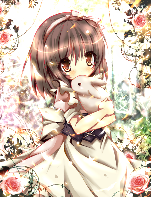 1girlbrown eyesbrown hairfemale focusflowerhair ribbonhairbandheadbandpink flowerpink roserabbitribbonroseshort hairsolo