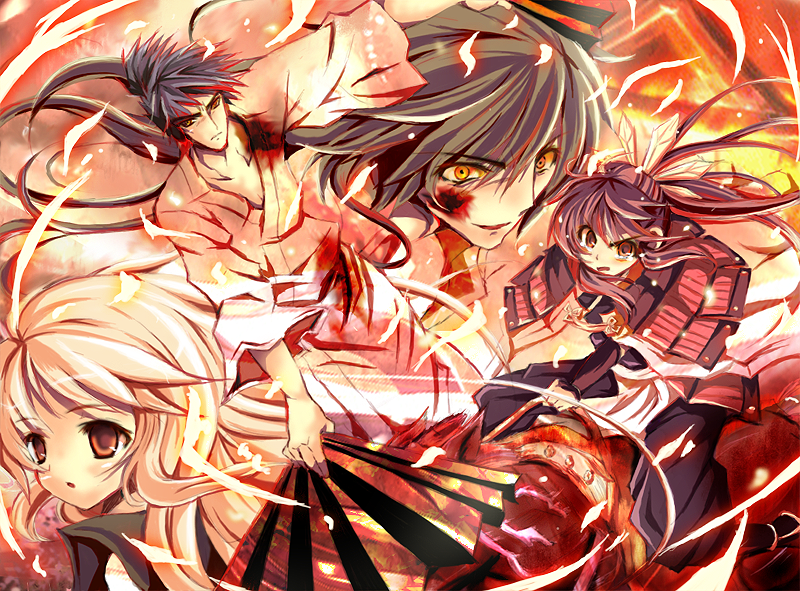 2boys2girlsarmorblack hairblonde hairbloodbrown eyesbrown hairchinese clotheshand fanjapanese armorlong hairmultiple boysmultiple girlssamuraishoulder armorsodeyellow eyes