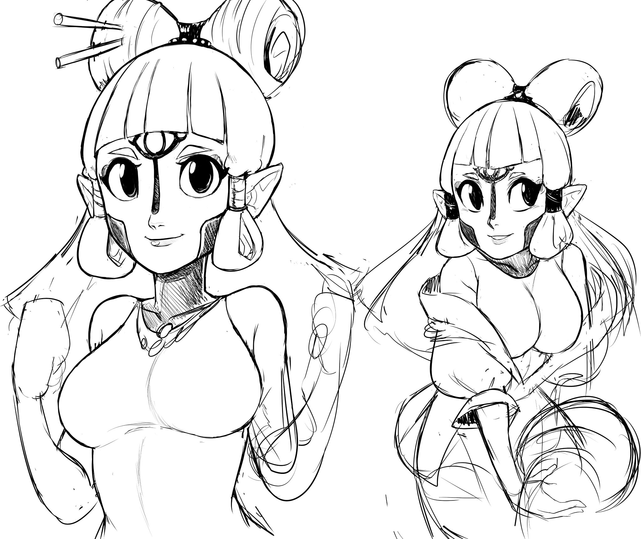 bodystockingfacial tattoohair bunhair ornamenthair ringslong hairlooking at viewerpointy earssheikahsketchskin tightstraight hairtattoo