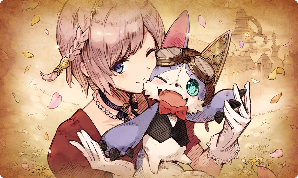 1girlalkemono (ta ga tame no alchemist)blue eyesbraidclosed mouthdressfangfiona (ta ga tame no alchemist)glovesjewelrylooking at viewermeadownecklaceone eye closedopen mouthorange petalsoutdoorspearl necklacepink petalsred dresssingle braidskin fangsmilestuffed toywhite glovesyellow petals