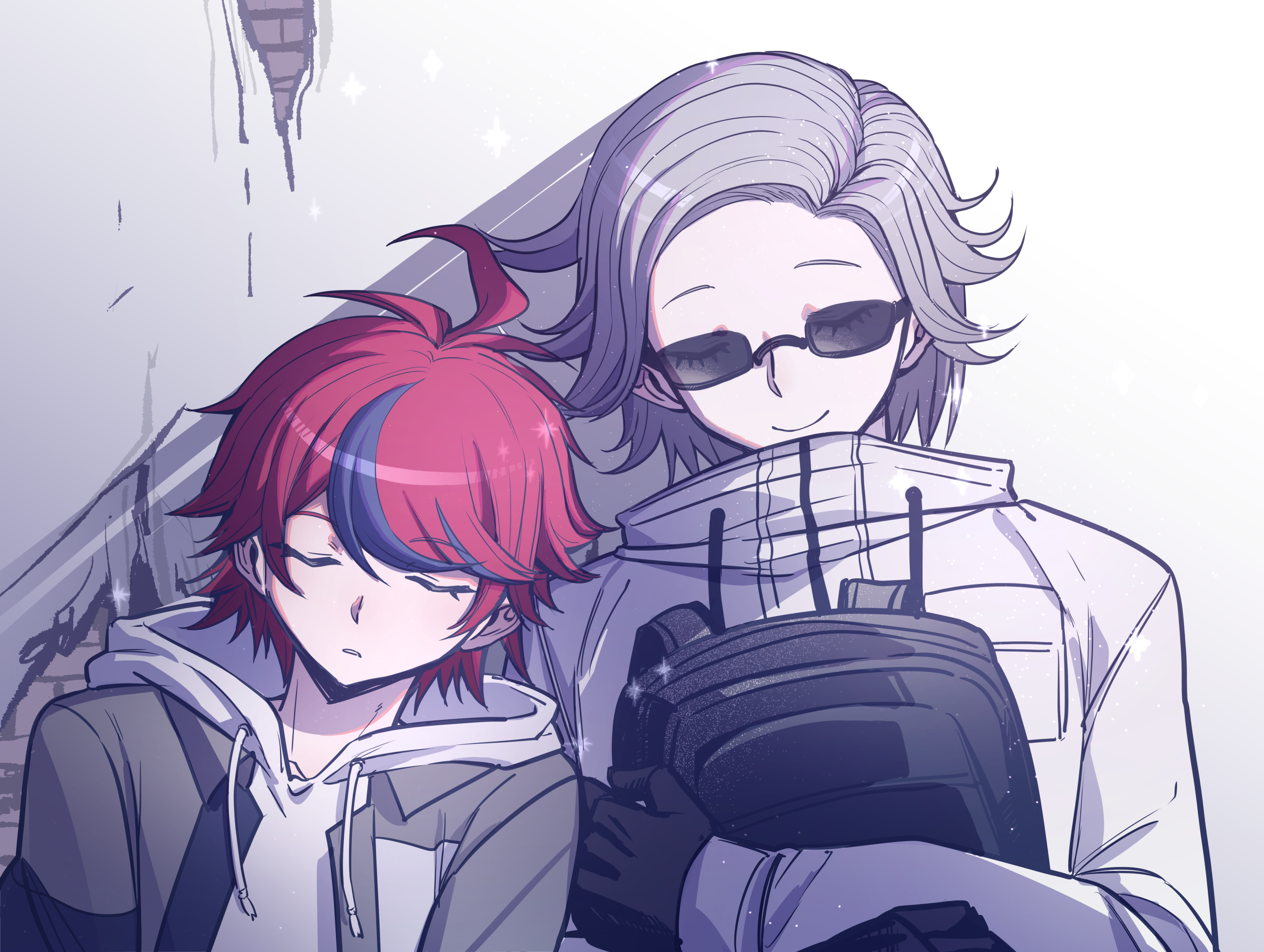 2boysahogebackpackbagblack bagblack glovesblack jacketblack streaksbreast pocketclosed eyesglassesglovesgrey hairgrey jacketholdingholding baghoodhoodiejacketjacket over hoodieleaning on personleaning to the sidemale focusmulticolored hairmulticolored jacketmultiple boysopen clothesopen jacketparted lipspocketred hairshadowshort hairsidelightingsleepingsmilestreaked hairsunglassestwo-tone jacketwhite hoodiewhite jacket