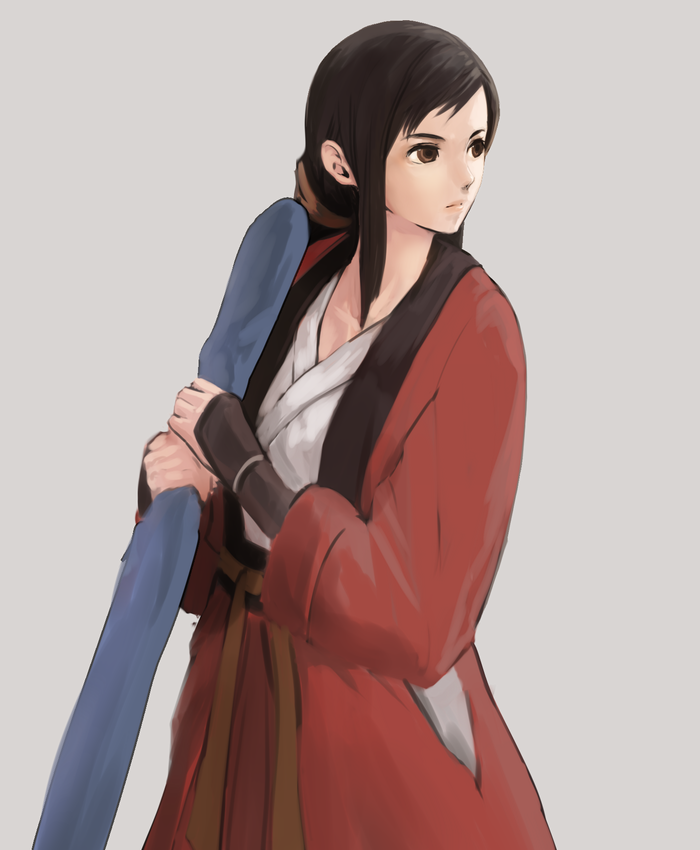 1girlblack hairbrown eyesfemale focushakamahakama skirtjapanese clotheskimonoponytailred hakamaskirtsoloweapon
