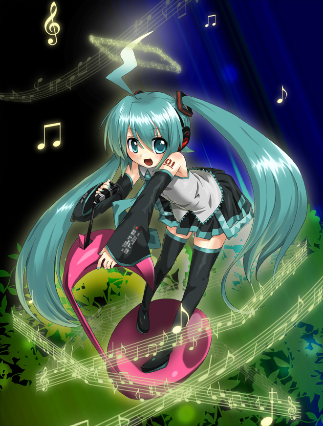 ahogeaqua eyesaqua hairdetached sleeveslong hairmusical notenecktieskirtsolothighhighstwintailsvery long hairzettai ryouiki