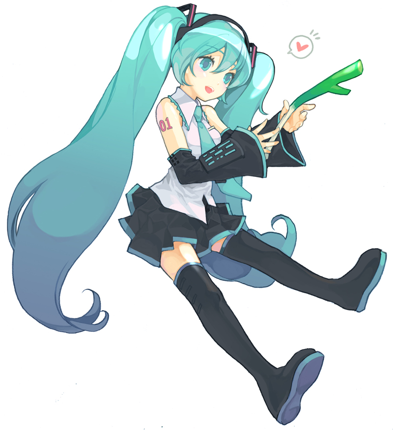 aqua eyesaqua hairdetached sleeveslong hairnecktiesittingskirtsolospring onionthighhighstwintailsvery long hairzettai ryouiki