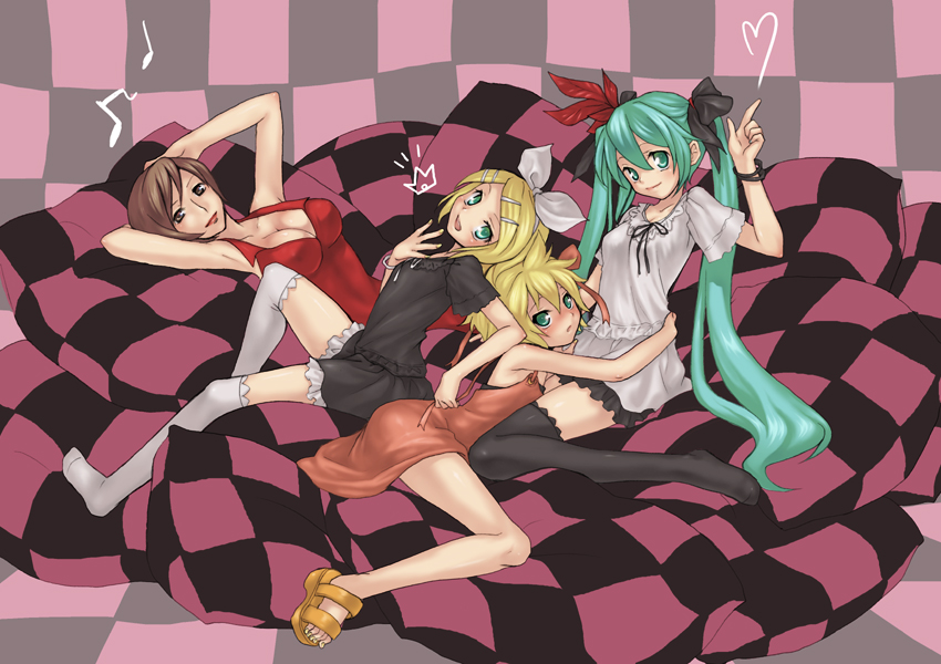 1boy3girlsaqua hairarmpitsarms upblushcrossdressingdressfeetmultiple girlsthighhighstraptwintails