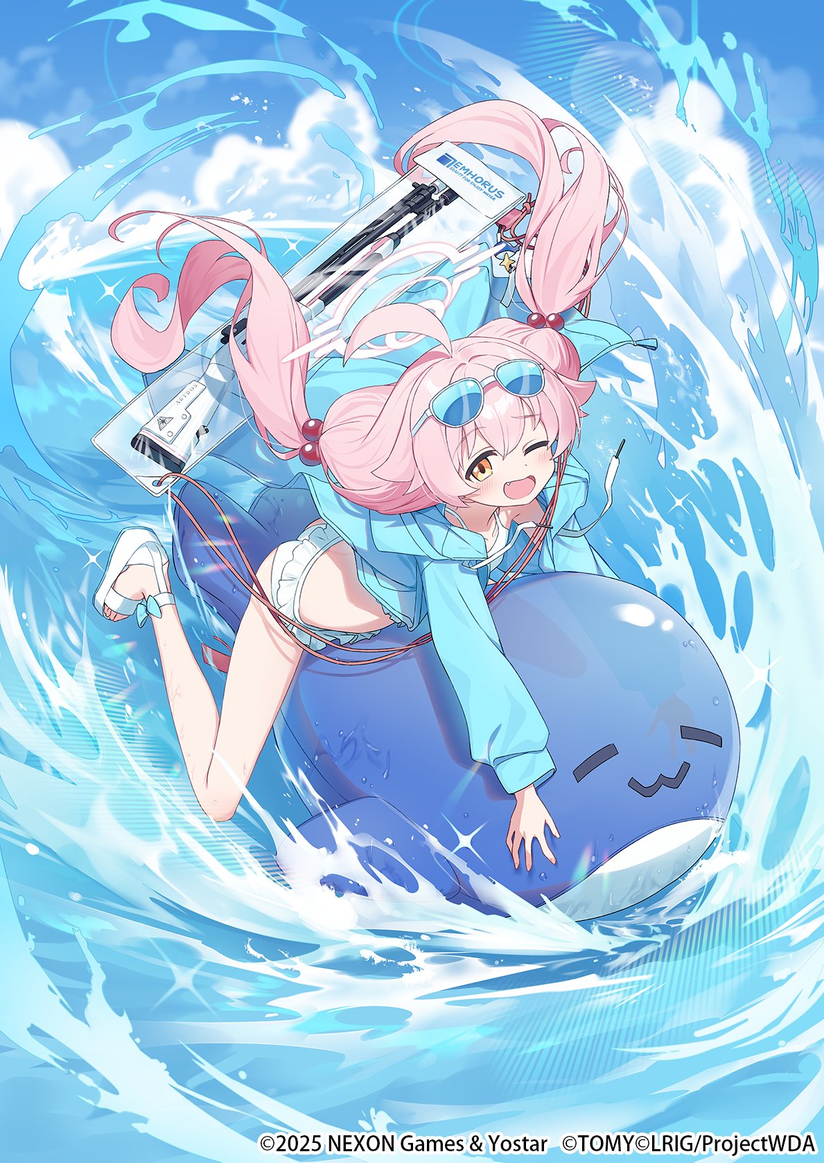 1girlafloatahogeassberetta 1301bikiniblue skyeyewear on headfangfrilled bikinifrillshaloinflatable toyinflatable whalelooking at viewerlow twintailsoceanopen mouthorange eyespink hairskysmilesolosunglassesswimsuittwintailswaterwaveswhite bikini