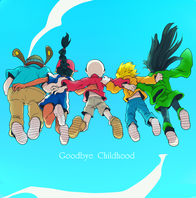 2girls3boysbaldblack hairblonde hairblue backgroundblue skybraidbrown hairclothes grabdark skinearringsenglish texteveryonefallingfloating hairfrom behindfrom belowfull bodyhathoodhoodiejewelryjumpinglong hairlong sleevesmultiple boysmultiple girlspantyhoseshirt grabshortsskysleeves past fingerssleeves past wristssunglassessweatervery long hair
