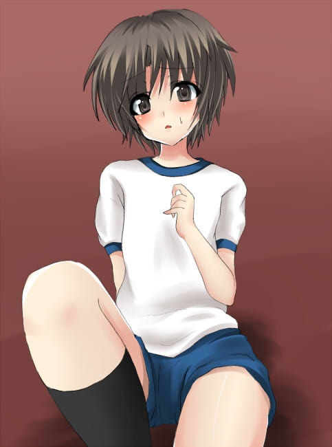 1boyandrogynousblushbrown eyesbrown hairburumakneehighsmale focusopen mouthshort hairshortssittingsockssolosweatdroptrap