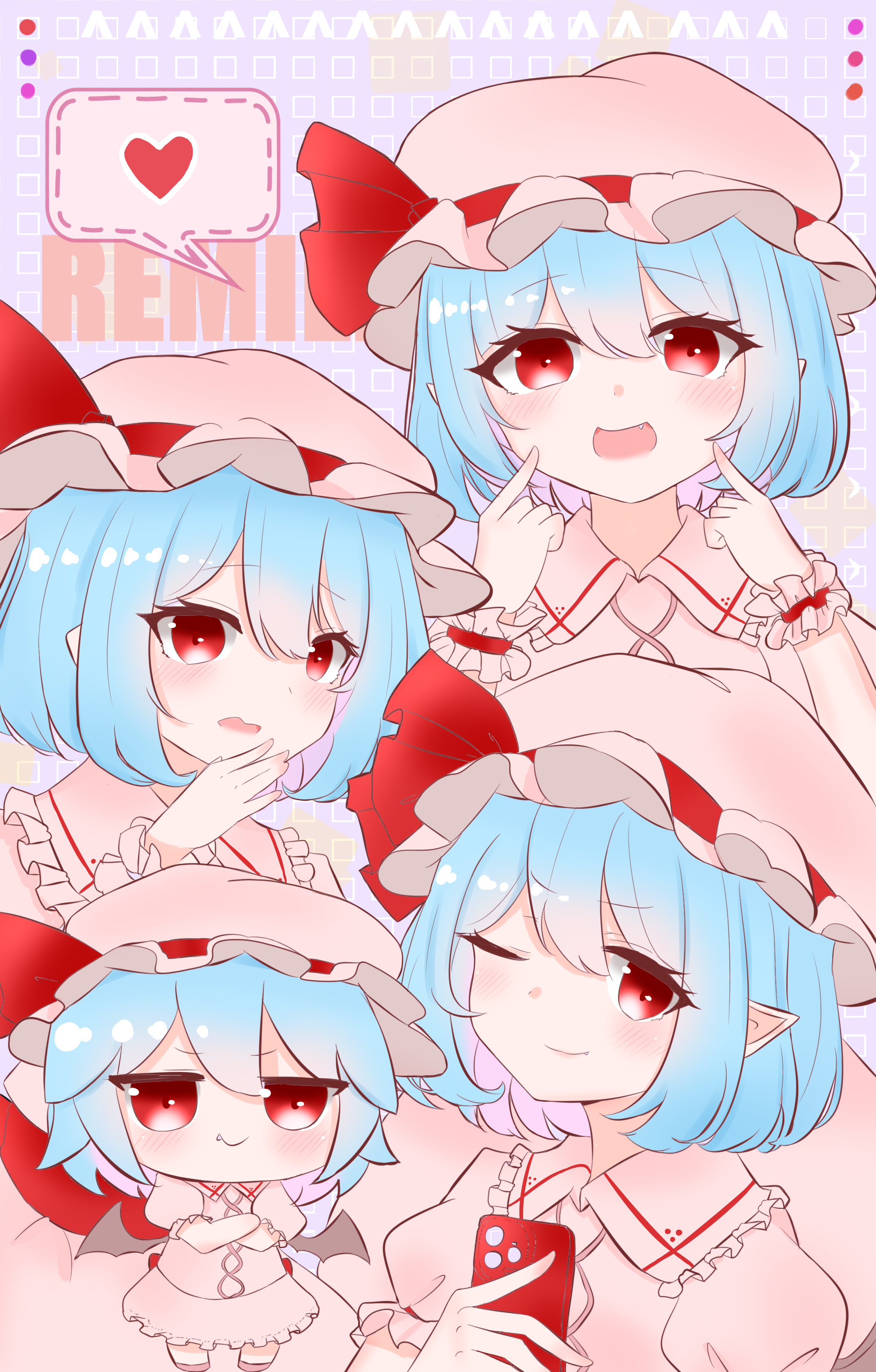 1girlbat wingsblushcellphonecharacter nameclosed mouthfangfrilled cuffsfrilled hatfrilled shirt collarfrilled skirtfrillshair between eyeshand uphands uphathat ribbonheartholdingholding phoneindex finger raisedlooking at viewermob capmultiple viewsone eye closedparted lipsphonepink hatpink shirtpink skirtpointy earspuffy short sleevespuffy sleevespurple hairred eyesred ribbonribbonshirtshort hairshort sleevesskin fangskirtsmartphonesmilespeech bubblespoken heartwingswrist cuffs