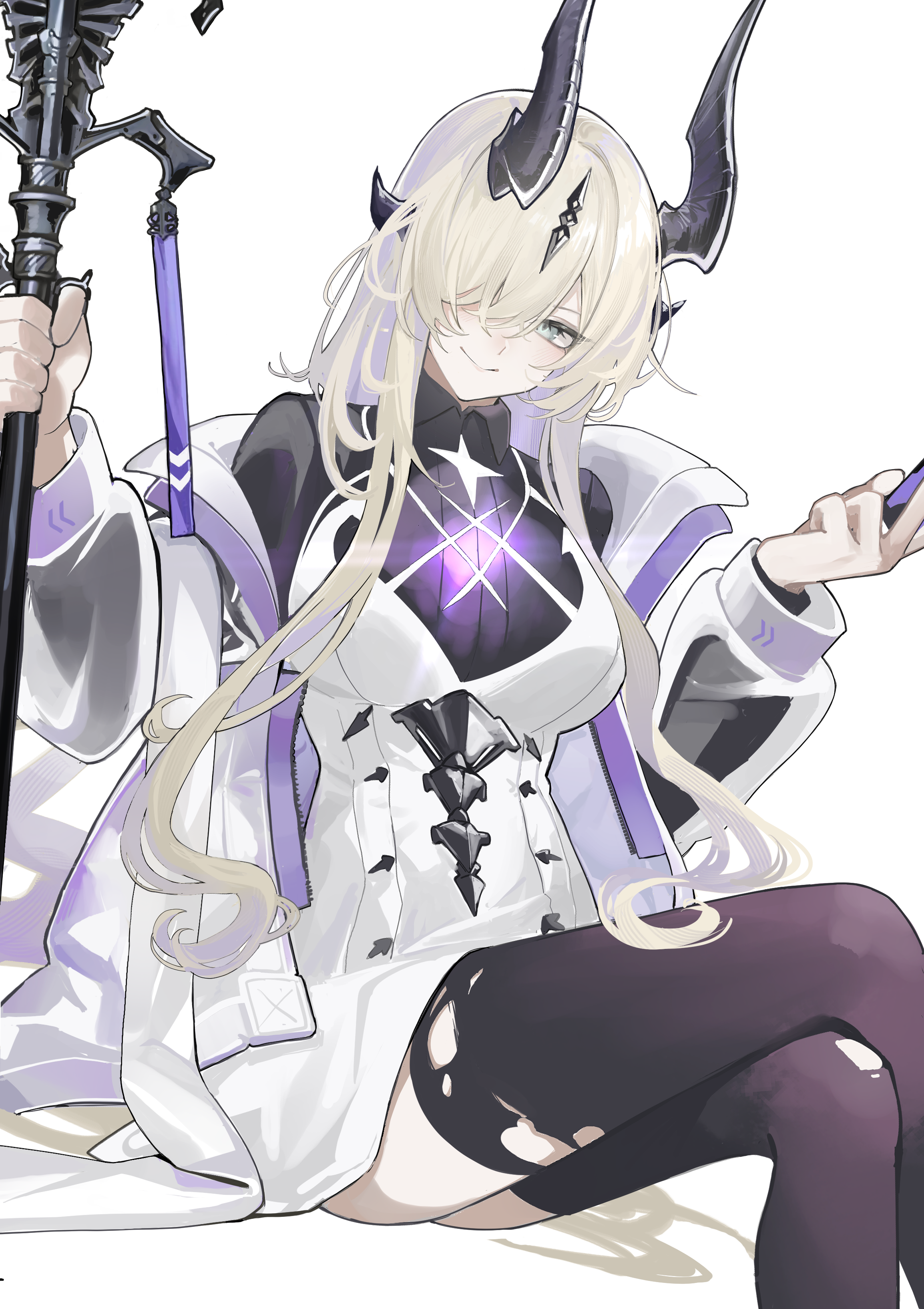 1girlblack thighhighsbreastsdragon girldragon hornsdressgreen eyeshair over one eyeholdingholding staffhornslarge breastslong hairlooking at viewersimple backgroundsittingsmilesolostaffthighhighsthighstorn clothestorn thighhighsvery long hairwhite backgroundwhite dresswhite hair