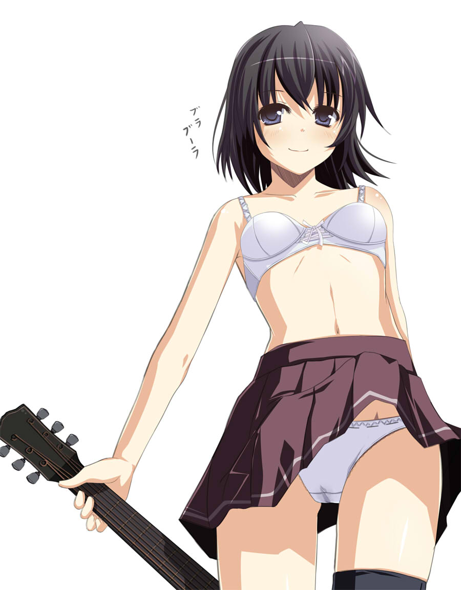 1girlbare armsbare shouldersblack hairblack skirtblack thighhighsblue eyesblushbrabreastscameltoecollarbonecowboy shotfemale focusfrom belowguitarholdingholding instrumentinstrumentlingerienavelpantiespantyshotpleated skirtshiny skinshort hairsingle thighhighskirtsmall breastssmilesolothighhighsunderwearwhite brawhite pantieswindwind lift