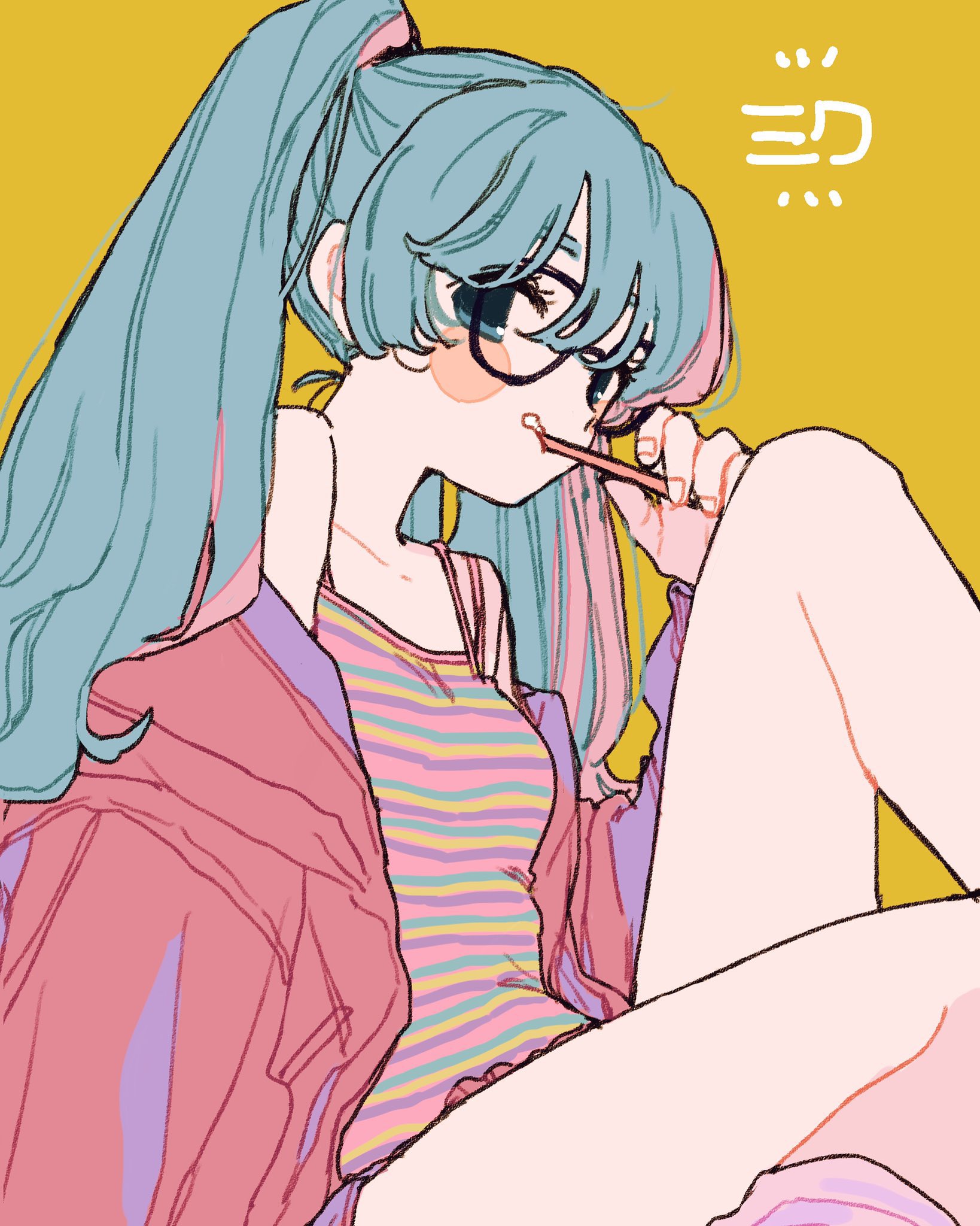 1girlaqua eyesaqua hairbare shouldersblush stickersbreastscamisoleglasseshair between eyesjacketjacket partially removedlong hairlooking at viewermedium breastspink jacketshirtsittingsolostriped camisolestriped clothesstriped shirttwintailsupper bodyyellow background