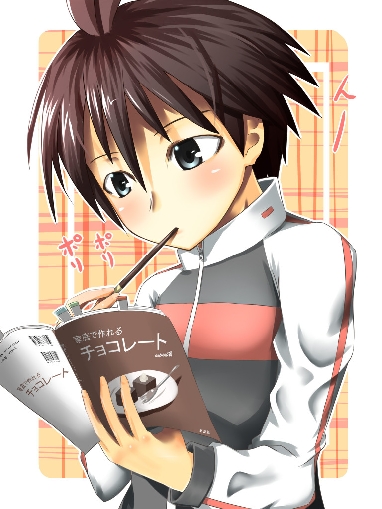 00santenna hairbookbrown haireatingfoodgrey eyesjacketopen bookpockyraglan sleevesreadingshort hairsolo