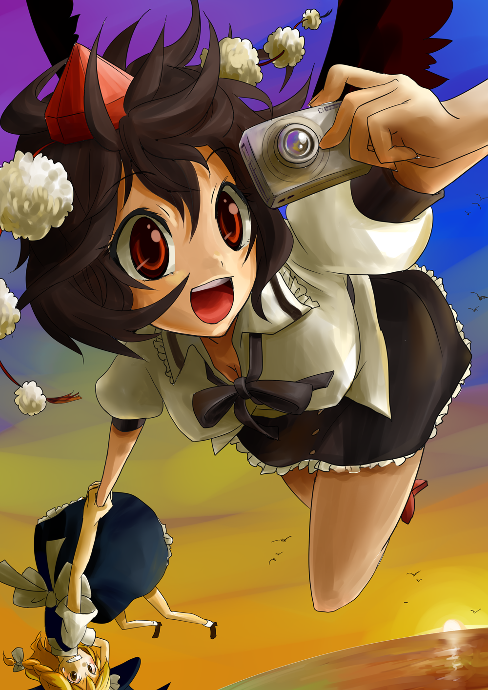 2girlsbirdblack wingsblonde hairbraidbrown eyesbrown haircameracan you read my minddressfemale focusflyinggetahatholding handslong hairmultiple girlsred eyesribbonshort hairskirtsunsettengu-getatokin hatwingswitchwitch hat