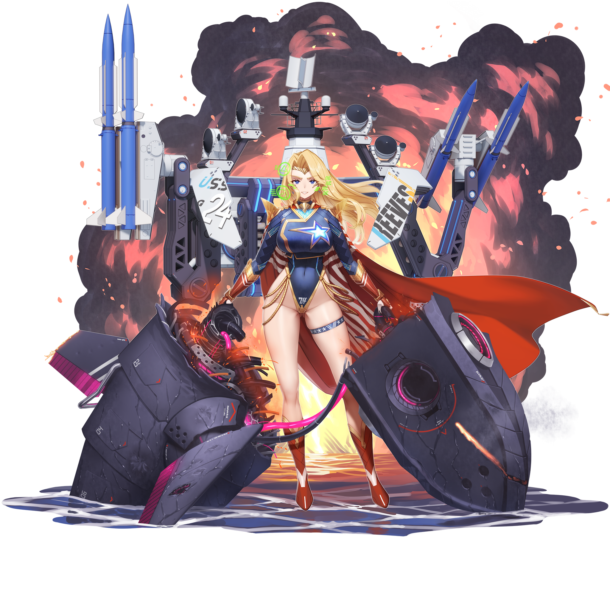 1girlblonde hairblue eyesblue leotardbootsbreastscapecircletexplosionexplosion backgroundfull bodyglovesgluteal foldgold circletgrinlarge breastsleotardlong hairlong sleeveslooking at viewermissilered bootsred capered glovesreeves (warship girls r)riggingrocket launchersmilesolostar (symbol)thigh straptransparent backgroundweapon