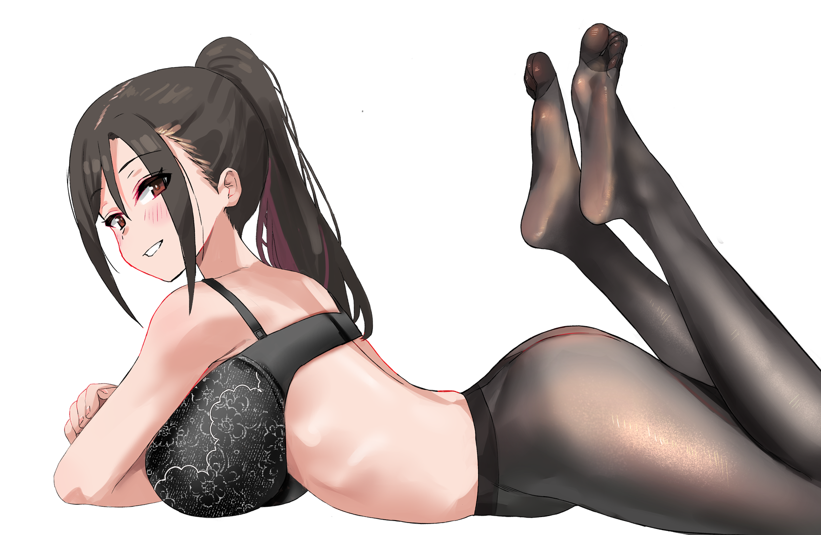 1girlblack brablack hairblack pantyhoseblushbrabrown eyeslyingno shoeson stomachpantyhoseponytailsimple backgroundsmilesolessolounderwearwhite background