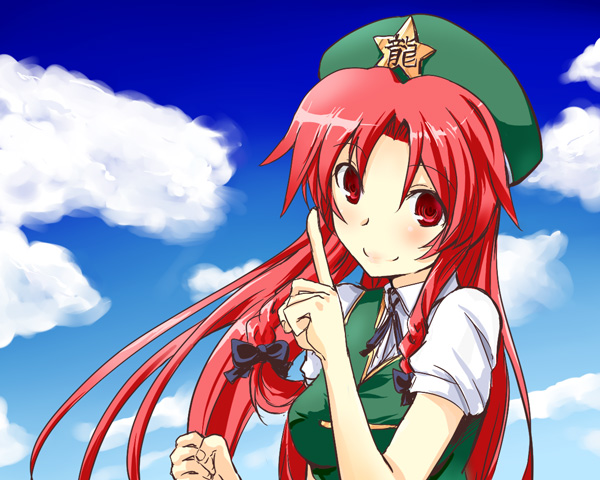 1girlbraidclenched handclouddayfemale focushatlong hairlooking at viewerpointingred eyesred hairskysmilesolotwin braidsupper body