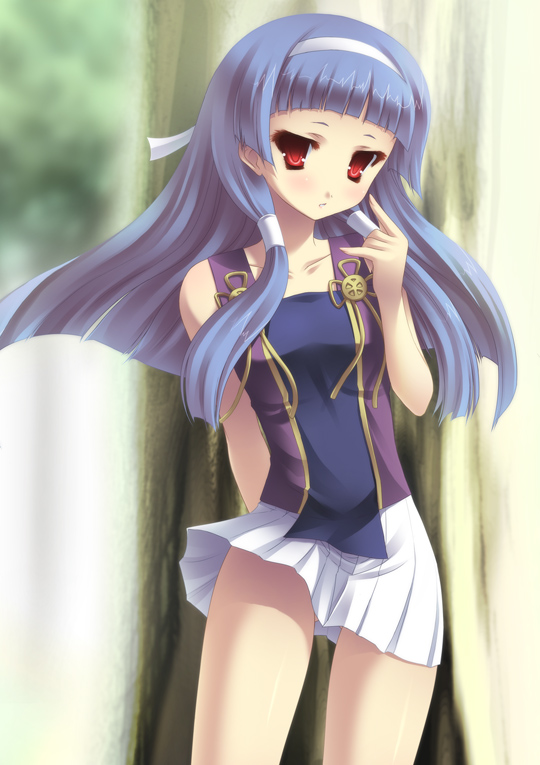 00s1girlblue hairblunt bangsclothes liftcollarbonedayfemale focuslegslong hairoutdoorsred eyesskirtskirt liftsolostanding