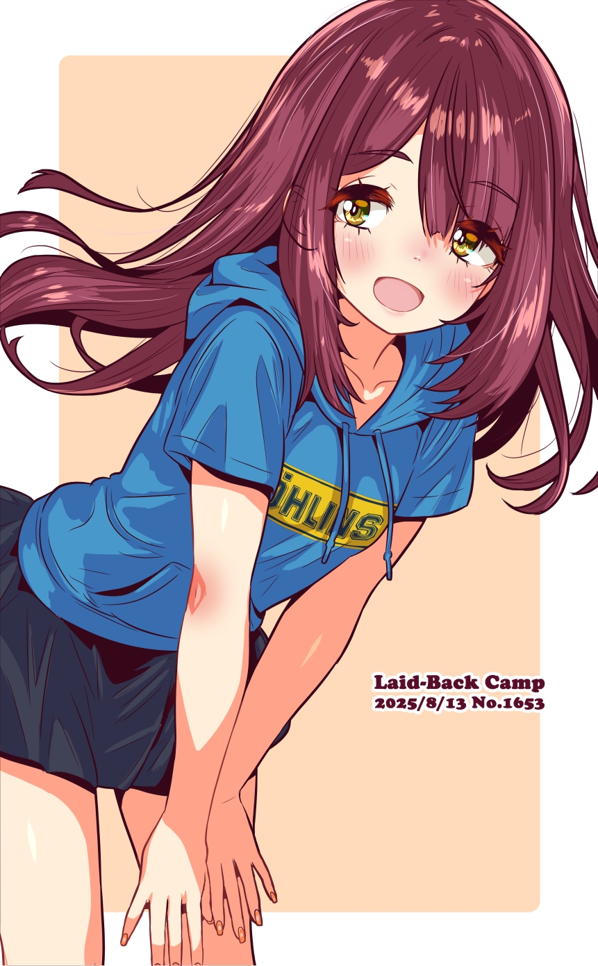 :d1girlalternate costumeblack skirtblue jacketblushborderbrown haircowboy shothands on own kneehoodhood downhooded jacketjacketleaning forwardlong hairlooking at viewerminiskirtnose blushopen mouthoutside bordershort sleevesskirtsmilesolostandingstraight hairvery long hairwhite borderyellow eyes