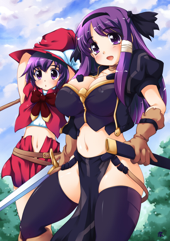 2girlsblushbowbreastsfantasygloveshatlarge breastsmidriffmultiple girlsnavelpurple eyespurple hairribbonswordthighhighsweaponwitch hat