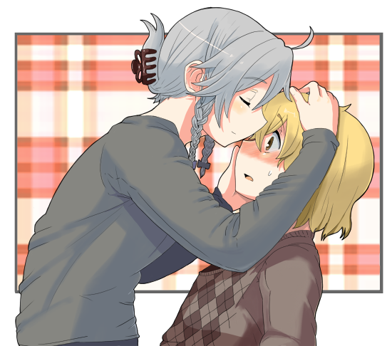 macaronk, original, absurdres, highres, 2boys, backpack, bag, blurry, brown hair, grey pants, male focus, multiple boys, open mouth, pants, people, pointing, poster (object), railing, shirt, short hair, shorts