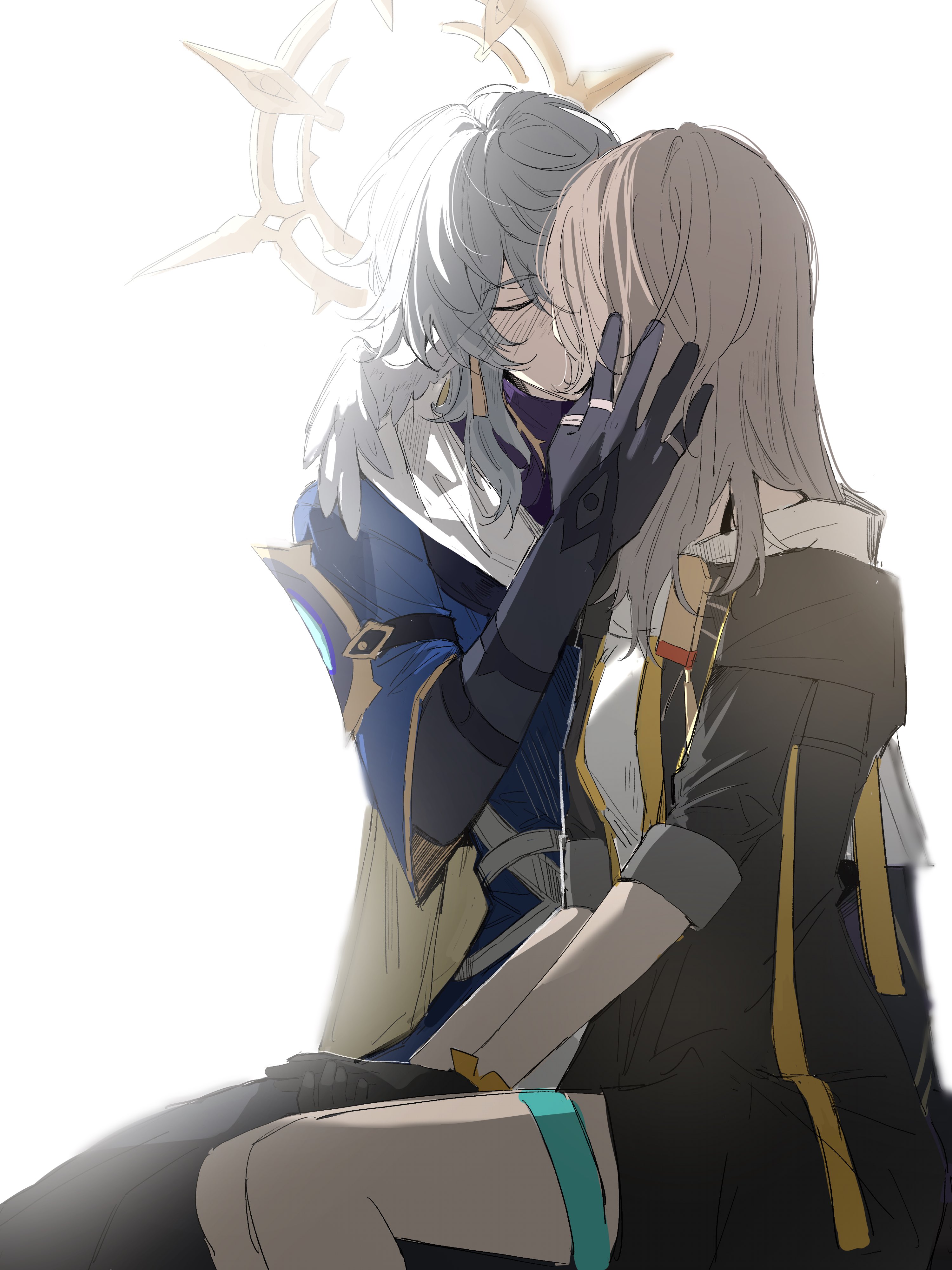 1boy1girlblack coatblack glovesblushclosed eyescoatfeet out of frameglovesgrey hairhalohalo behind headhand on another's headhead wingsheterojewelrykisslong hairmultiple ringsoff shoulderown hands togetherringshirtsimple backgroundthigh strapwhite backgroundwhite shirtwhite wingswingsyellow halo