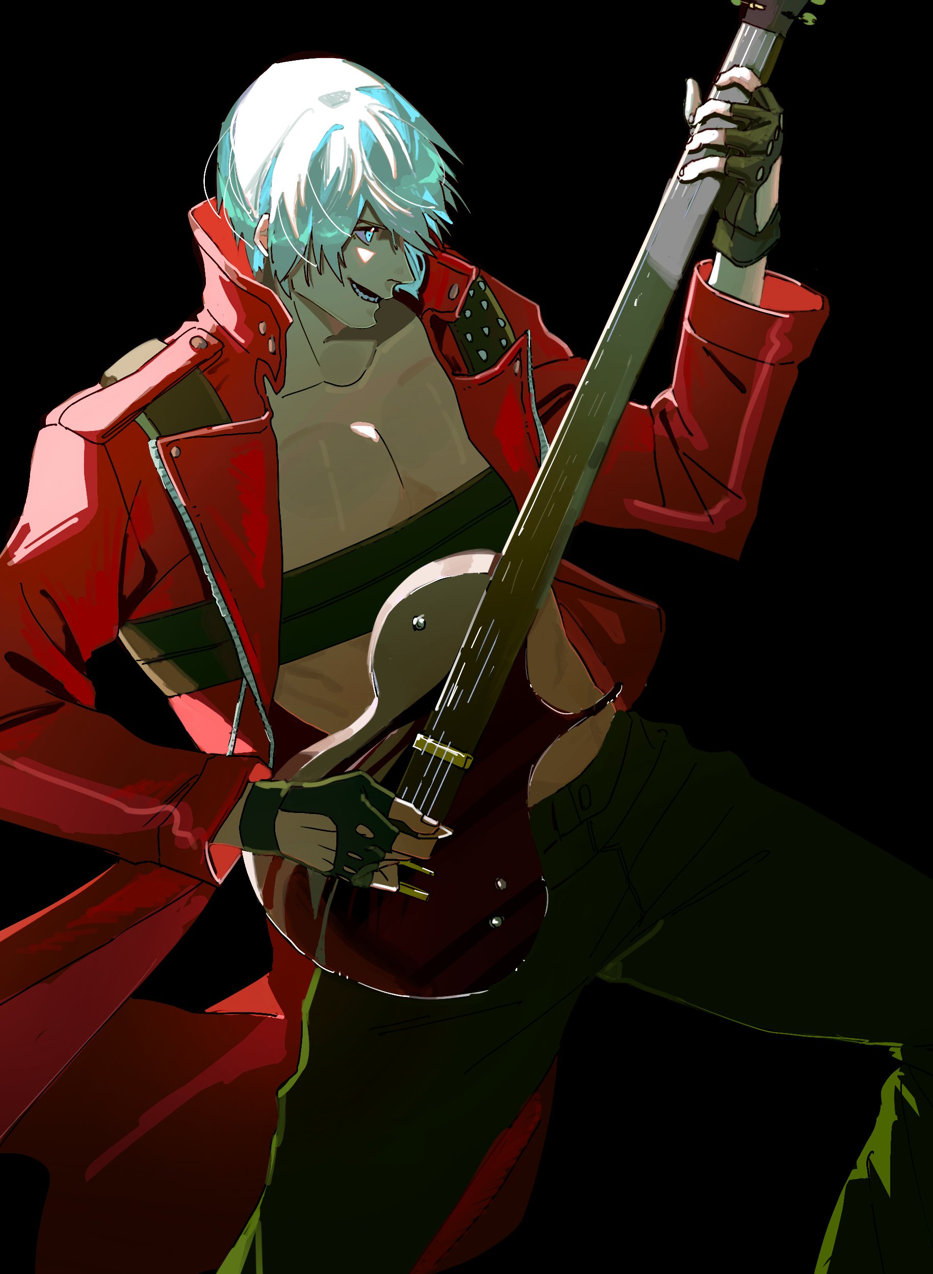 1boyblack backgroundblack glovesblack pantsblue eyeschest strapcoatcollarbonecowboy shotfingerless glovesglovesguitarhair between eyesinstrumentlong coatmale focusmidriffmusicopen mouthpantspectoralsplaying guitarplaying instrumentred coatshort hairsmilesolowhite hairyu 0716