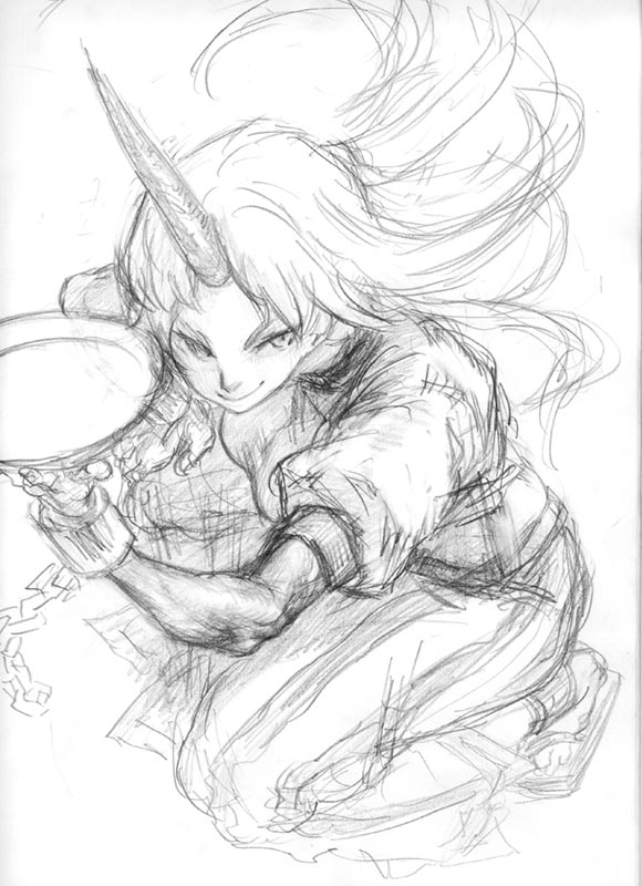 1girlchaincupfemale focusgreyscalehead tilthornslong hairmonochromemuscularonisakazukisingle hornsketchskirtsolostriped clothesstriped skirt