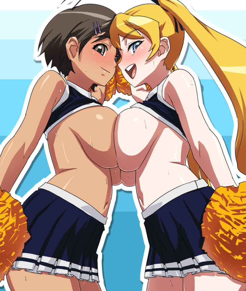 2girlsbare shouldersblonde hairblue eyesblushbreast pressbreastsbrown eyesbrown haircheerleaderclothes liftdark skindark-skinned femalelarge breastslong hairmultiple girlsshirt liftshort hairstandingsweatsymmetrical dockingtantwintailsunderboob