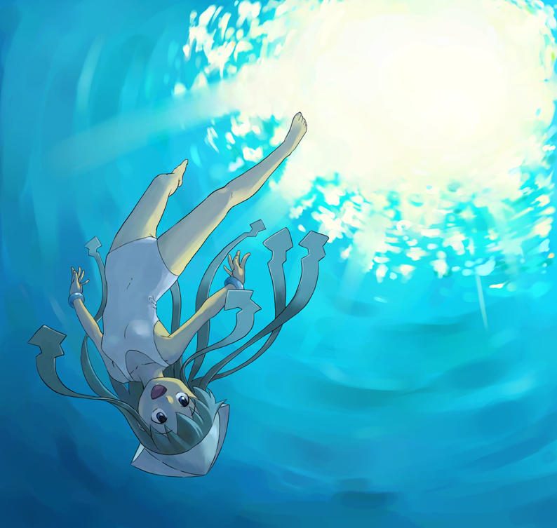 1girlbarefootfemale focusflat chestlong hairone-piece swimsuitsmilesoloswimmingswimsuitunderwatervery long hairwater