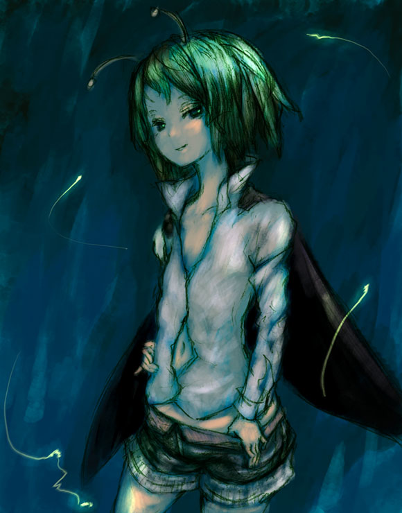 1girlandrogynousantennaebugfemale focusfirefliesfireflyflat chestgreen hairhead tiltinsectnavelnightpopped collarraised eyebrowsreverse trapshortssolo
