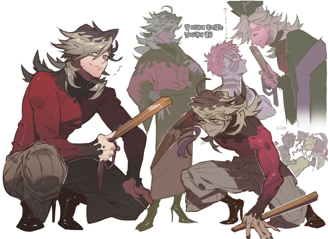 2boysblack hatblack shoesblonde hairboosk 01brown hairclosed eyesfacial markfighting stanceforked eyebrowsgrey pantshair between eyeshakamahakama pantshand fanhatheight differencehigh heelsholdingholding fanjapanese clotheslong hairmale focusmulticolored hairmultiple boysmultiple viewspantsred hairred shirtshirtshoesshort hairsmilesquattingstandingtwo-tone hairwhite background