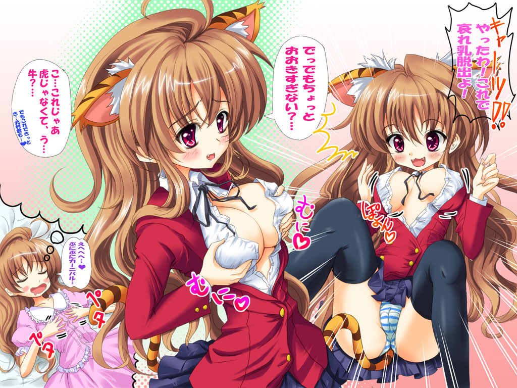 00sanimal earsblack thighhighsblushbreastsbreasts squeezed togetherbrown haircameltoecleavagedreamingfanglarge breastslong hairno brapantiespantyshotred eyesskirtsolostriped clothesstriped pantiestailthighhighstiger earstiger tailunderwear