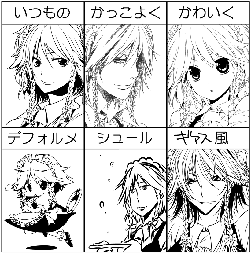 1girlbraidchartchibifemale focusgreyscalemaidmonochromemultiple viewsparodytwin braidsupper bodywhite background