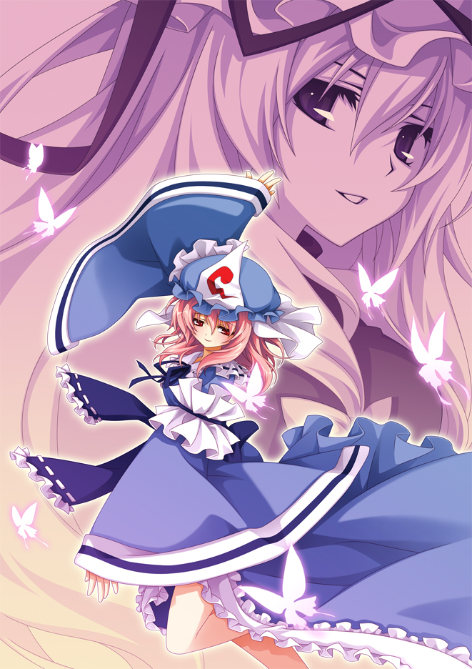 2girlsbugbutterflydancingfemale focusfrillshatjapanese clotheskimonolegsmultiple girlspink hairred eyessmilewide sleeves