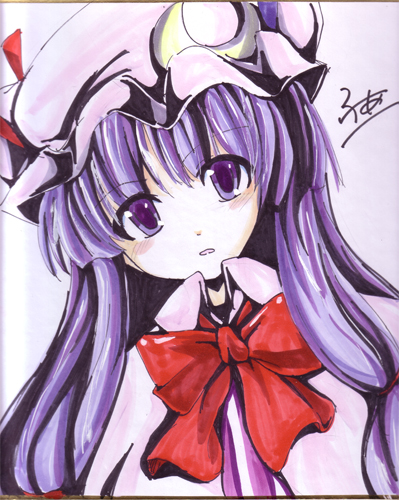1girlbowcrescentcrescent hat ornamentfemale focusgradient backgroundhathat ornamentlong hairpurple eyespurple hairshikishisolo